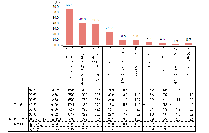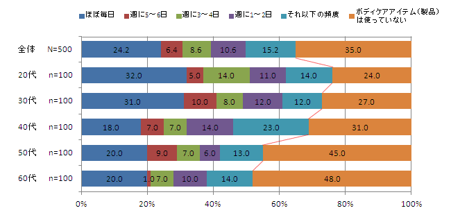 年代別に見ると、「ほぼ毎日」という回答が多かったのは20代と30代で、それぞれ30%強。40代、50代、60代は「ほぼ毎日」と答えた人は約2割にとどまる。50代では45.0%が、60代では48.0%が「ボディケアアイテム(製品)は使っていない」と答えた。