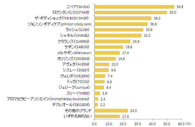 最も認知度が高かったのは、「ニベア(NIVEA)」(54.8%)。次に多かったのは「ロクシタン(L'OCCITANE)」(50.0%)。続いて、「ザ・ボディショップ(THE BODY SHOP)」(39.2%)、「ジョンソン ボディケア(Johnson's body care)」(36.6%)、「ラッシュ(LUSH)」(33.6%)、「シャネル(CHANEL)」(32.2%)、「クラランス(CLARINS)」(24.6%)となった。「いずれも知らない」と回答した人は17.4%だった。