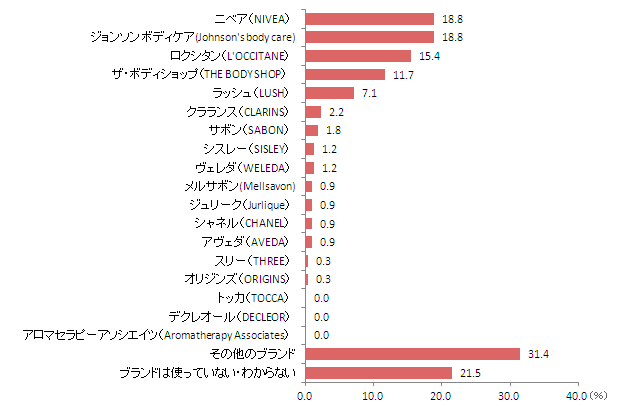 次に、ボディケアアイテム(製品)を使ってボディケアを行っている人にのみ、使用しているブランドを回答してもらった。