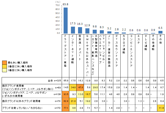 それ以外の3グループでは「ドラッグストア・薬局」が最も多くなっており、「百貨店・デパート」は2.9%~13.0%となった。 ジョンソンボディケア・ニベア・メルサボン使用者では「ドラッグストア・薬局」が93.5%で圧倒的に多く、2番目は「GMS(総合スーパー)やそれ以外のスーパー」(16.7%)。使用するブランドによって購入場所に違いが出ている。