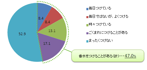 香水をつけることがある人は、「毎日つけている」という人から「ごくまれにつけることがある」という人までをすべて合わせると、47.0%で約2人に1人という結果になった。