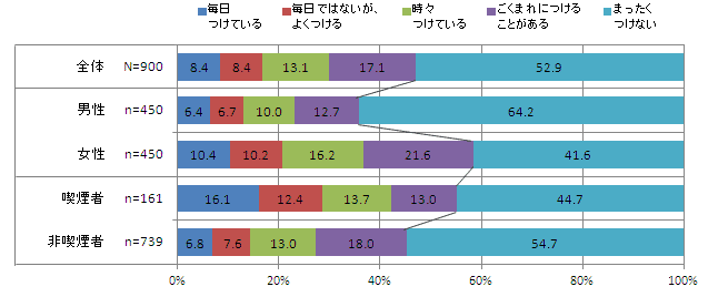 つける頻度の内訳としては、「毎日つけている」と「毎日ではないが、よくつける」が同率で8.4%、「時々つけている」13.1%、「ごくまれにつけることがある」が17.1%となった。「まったくつけない」と答えた人は52.9%。
