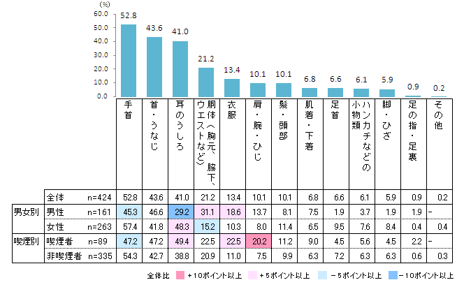 喫煙状況別で見ると、喫煙者は「耳のうしろ」「衣服」「肩・腕・ひじ」につける人の割合が高くなっており、それぞれ非喫煙者に比べ10ポイント以上上回った。