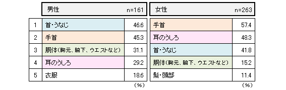 最も多かったのは「手首」(52.8%)。続いて「首・うなじ」(43.6%)、「耳のうしろ」(41.0%)、「胴体(胸元、脇下、ウエストなど)」(21.2%)となった。