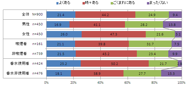 全員に、外出先や職場・学校、交通機関などで他人がつけている香水が気になることがあるかどうかを聞いた(好きな香りと嫌いな香り、どちらの場合も含む)。すると、「よくある」(21.4%)または「時々ある」(44.2%)と回答した人が65.6%で、約3人に2人が気になることが「ある」という結果になった。「ごくまれにある」(24.9%)も含めると9割に上る。「まったくない」と答えた人は9.4%にとどまった。