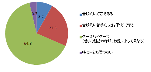 最も多かったのは、「ケースバイケース(香りの強さや種類、状況によってことなる)」(64.8%)で、6割を超えた。