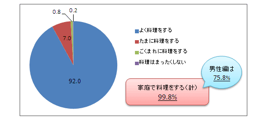 また 、就労状況別で見ると 、「よく料理をする」と答えた人の割合に関しては、わずかに専業主婦の女性の方が、夫婦共働きの女性より高くなった。しかし、「よく料理をする」「たまに料理をする」を合わせた数値は 100.0% と 99.6% となり、就労 状況による 差はほぼないに等しい。