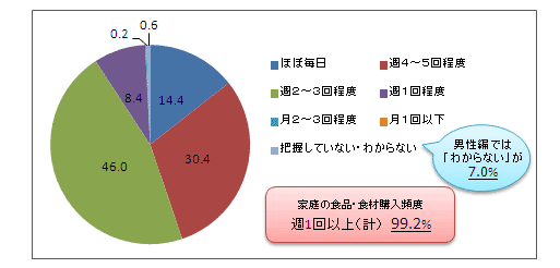 男性編では、食品の購入頻度を「把握していない、わからない」と答えた人が7.0%いたが、女性編では0.6%と非常に少なかった。