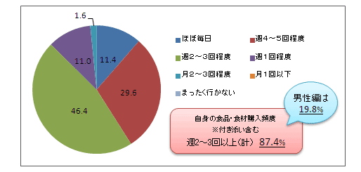 すると、87.4%の女性が週2~3回以上の頻度で食品・食材の買い物をしていることがわかった。詳細な内訳としては、「ほぼ毎日」が11.4%、「週4~5日程度」が29.6%、「週2~3回程度」が46.4%となっている。「週1回程度」は11.0%、「月2~3回程度」は1.6%で、「月1回以下」「まったく行かない」は0だった。