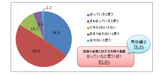 次に、家庭で食べる食事について、好みや考え方が夫婦間で合っていると思うか、合わないと思うかを答えてもらった。