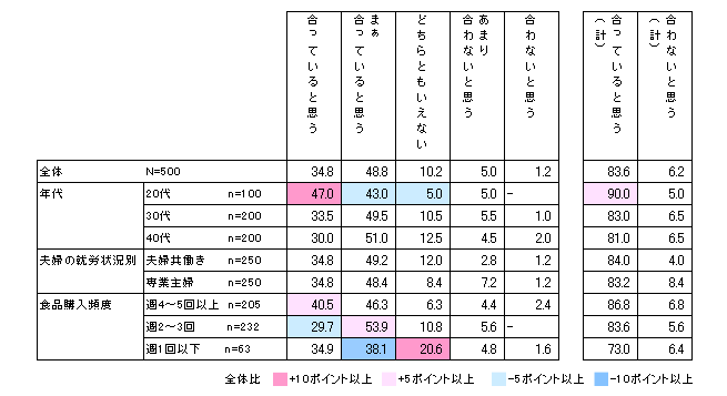 また、Q3の食品・食材購入頻度の回答別でも比較すると、週4~5回以上の頻度で買い物をしている女性は「合っていると思う(計)」が86.8%と8割を超えているが、週1回以下の女性では73.0%と10ポイント以上下がり、「どちらともいえない」が2割になっている。