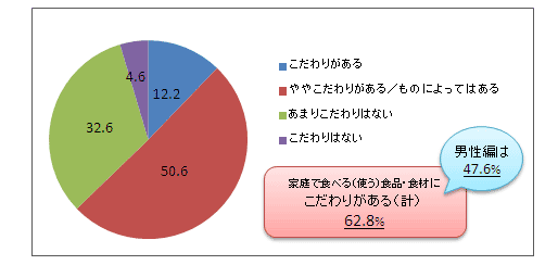 家庭で食べる(使う)ための食品や食材について、女性の方はどのぐらいこだわりを持っているのだろうか。結果は、「こだわりがある」と答えた人は62.8%で、男性編の47.6%に比べ15ポイント高い結果となった。内訳としては、「こだわりがある」が12.2%、「ややこだわりがある/ものによってはある」が50.6%。「あまりこだわりはない」と答えた人は32.6%、「こだわりはない」は4.6%だった。