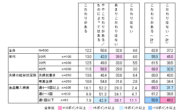 また、こちらも食品・食材の購入頻度(Q3)の回答別で比較したところ、買い物の頻度が高い人ほど「こだわりがある(計)」と答えた人の割合も高くなっている。週4~5回以上の人では68.3%と7割近いが、週1回以下の人では50.8%と5割にとどまった。