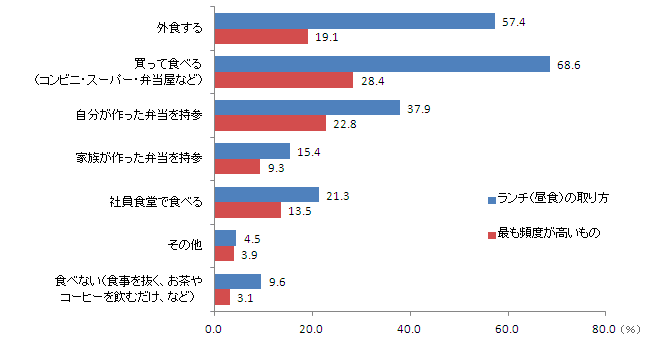 まず、仕事がある日のランチ(昼食)の取り方についてたずねた。自分がすることのあるランチの取り方をすべて選択してもらい、その中で最も頻度が高いものを1つだけ答えてもらった。