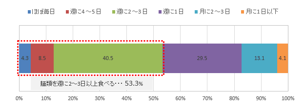 まずは麺類全般について、どのぐらいの頻度で食べているかを聞いた。最も多いのは「週に2~3日」で40.5%。次に多いのが「週に1日」で29.5%となった。「ほぼ毎日」は4.3%、「週に4~5日」は8.5%で、約8人に1人が週4~5日以上の頻度で麺類の食事をしているという結果になった。週に2~3日以上の合計は全体の約5割。
