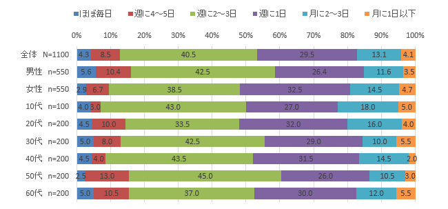 男女別に見ると、女性より男性の方が麺類を食べる頻度がやや高く、「週に4~5日」以上の頻度で食べている人の合計は、男性が16.0%に対し女性が9.6%で、6.4ポイントの差があった。また、年代別では、「週に4~5日」以上の合計は50代・60代が最も高く(15.5%)、次に多いのが20代(14.5%)。最も低いのは10代で7.0%となっている。