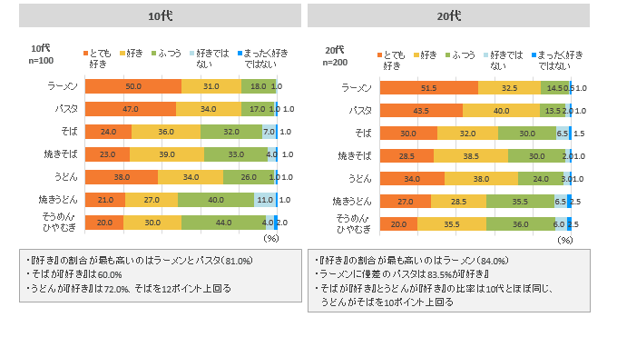 続いて、麺類のメニューのうち、【ラーメン】【パスタ】【そば】【焼きそば】【うどん】【焼きうどん】【そうめん・ひやむぎ】の7種類について、それぞれ好き嫌いを回答してもらった。