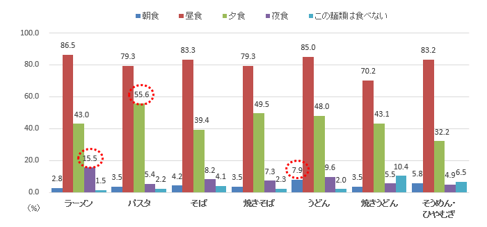 どの麺類も、「昼食」が圧倒的に多く、【焼きうどん】を除き、それぞれ8割前後となっている。タイミング別に見ると、「夜食」の割合が最も高いのはラーメンの15.5%で、その他の麺類は5~10%未満。「夕食」の割合が最も高いのは【パスタ】の55.6%で、次に高いのは【焼きそば】で49.5%となっている。「朝食」では【うどん】の7.9%が最も高い。また、「この麺類は食べない」と答えた人が最も多かったのは【焼きうどん】で10.4%、次いで【そうめん・ひやむぎ】となった。