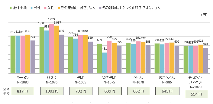 また、前問でその麺類が「好き」と答えた人と、「ふつう」または「好きではない」と答えた人で平均金額にどの程度の差があるかを比較すると、どの麺類についても、「好き」と答えた人の方が「ふつう」または「好きではない」と答えた人に比べ約1.1倍~1.2倍の高い金額となった。【ラーメン】では、ラーメン好きの人が1杯に支払えると思う上限金額の平均は835円で、そうでない人の平均は711円。【パスタ】ではその差が最も大きく、パスタ好きの人の上限金額の平均は1037円で、そうでない人は840円となり、200円近い差がついた。