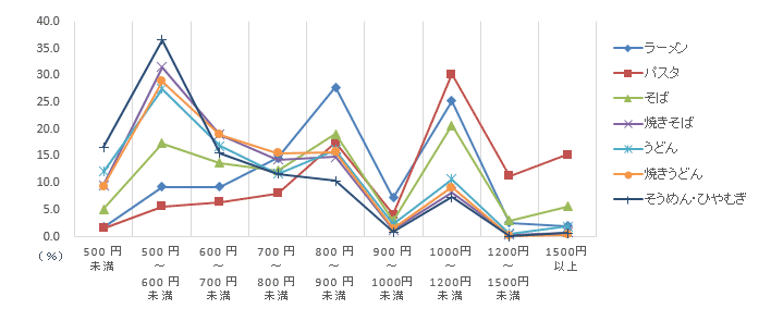 最後に、それぞれの麺類について、飲食店で外食する場合、その麺類のメニュー(1食分)に最大でいくらまで支払ってもよいと思うか、金額を入力してもらった。尚、前問で「この麺類は食べない」と答えた麺類については回答していない。