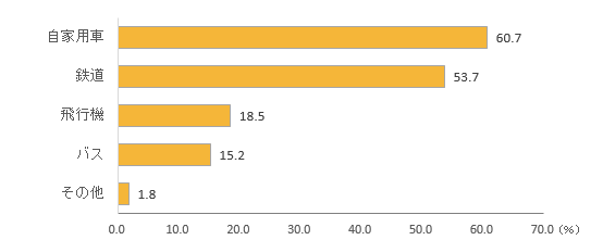 まずはじめに、帰省する際の交通手段を複数選択で答えてもらったところ、最も多いのは「自家用車」で60.7%。マイカー帰省をする人が約6割という結果になった。次いで多い「鉄道」は53.7%、「飛行機」は18.5%、「バス」は15.2%となっている。「その他」1.8%の具体的な内容としては、「レンタカー」、「バイク」、「船」など。