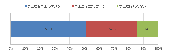 「手土産を毎回必ず買う」と答えた人は51.3%で約5割、「ときどき買う」と答えた人が34.3%で、8割を超える人が帰省時に手土産を購入していることがわかった。「手土産は買わない」と答えた人は14.3%だった。