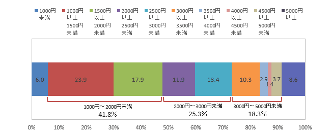 2000円~3000円未満(計)は25.3%、3000円~5000円未満(計)は18.3%となっている。