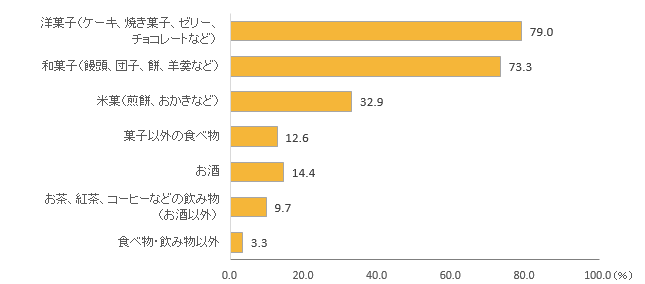 「米菓(煎餅、おかきなど)」は32.9%、「菓子以外の食べ物」は12.6%、「お酒」は14.4%、「お茶、紅茶、コーヒーなどの飲み物」は9.7%となった。「菓子以外の食べ物」の具体的な内容としては、かまぼこ・シュウマイといった惣菜系が多く、他にも佃煮、漬物、乾物、果物、パン、弁当などの回答があった。