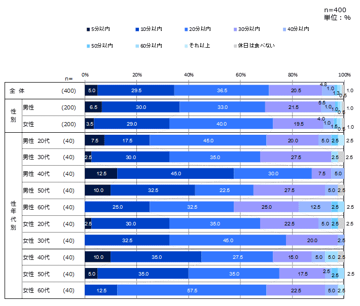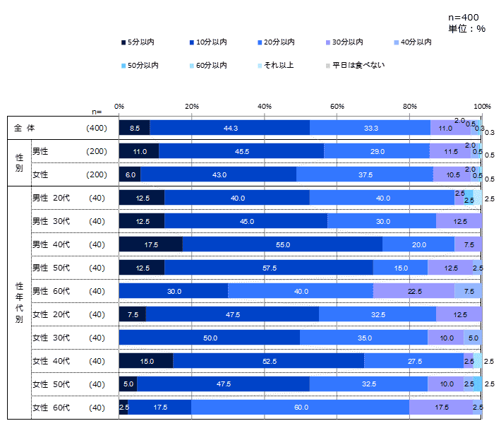 全体では「10分以内」44.3%が最も高く、次いで「20分以内」33.3%、「5分以内」8.5%と続く。年代別に見ると60代は「20分以内」が男性は40.0%、女性は60.0%で、40代は「10分以内 計」が男性は72.5%、女性は67.5%で、高い傾向が見られた。