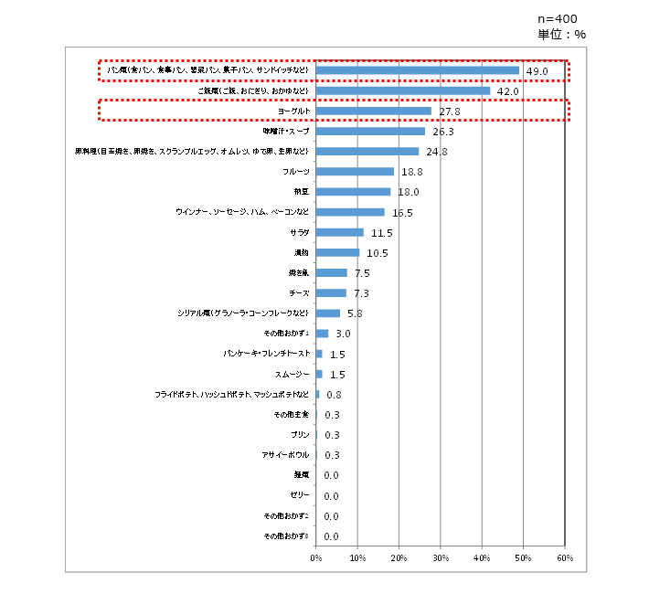 ■ 【平日】に最も食べている朝ごはんの主食は49.0%で「パン類」が最も高かった。おかず・デザートでは「ヨーグルト」