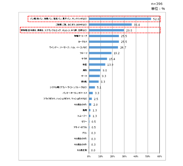 ■ 【休日】に最も食べている朝ごはんの主食は52.8%で「パン類」が最も高かった。おかず・デザートでは「卵料理」