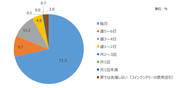 20代~40代の既婚・子あり世帯では、7割が洗濯を「毎日」しているという結果になった。次いで「週5~6日」が9.7%、「週3~4日」が11.2%で週3日以上が9割を占める。「週1~2日」以下の頻度は5.7%で、「家では洗濯しない(コインランドリーの使用含む)」は2.0%となった。