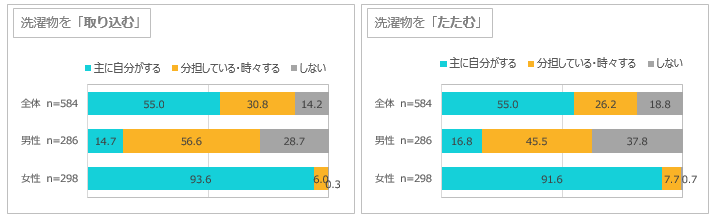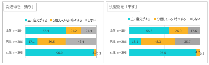 いずれも全体として見ると5~6割が「主に自分がする」、1割強~3割が「分担している・時々する」となっているが、男女別に見ると、すべての作業において女性は「主に自分がする」が9割を占めており、女性がメインで行っている家事であることがわかる。それでは、どの作業も男性は「しない」が圧倒的に多いのかというと、「分担している・時々する」が4割~5割強を占めており、「しない」は3~4割程度。「主にする」「時々する」といった頻度について、男性と女性で微妙な認識の差がある様子が窺える。
