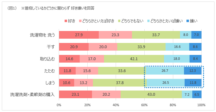 全自動式洗濯機が主流となり、以前よりも手間がかからなくなった『洗う』作業は、「好き(計)」が5割を占めた。『干す』と『取り込む』作業についても、『洗う』に比べると割合は下がるが、「好き(計)」が「嫌い(計)」を上回っている。反対に、嫌いな人の方が多いのが『たたむ』と『しまう』作業で、それぞれ「嫌い(計)」が約4割を占めた。