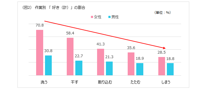また、作業の好き嫌いを男女別に見ると、女性は『洗う』に関して7割が「好き(計)」と回答しているが、作業が後半になるにつれてその割合が下がる傾向にあり、男性よりも顕著であった。(図2)