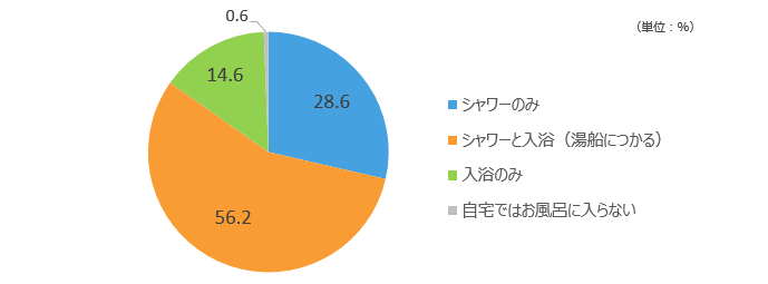 まず始めに、自宅での入浴の仕方として最も多い入り方を聞いたところ、「シャワーのみ」が28.6%、「シャワーと入浴(湯船につかる)」が56.2%、「入浴のみ」が14.6%となった。「自宅ではお風呂に入らない」と回答した人は0.6%だった。