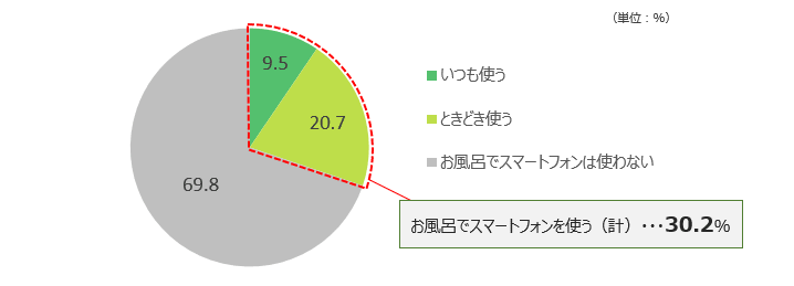 「いつも使う」が9.5%、「ときどき使う」が20.7%となり、スマートフォンユーザーのうち、お風呂の中でも使うことがある人は3割を占めた。