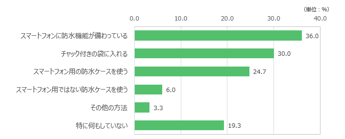 お風呂でスマートフォンを「いつも使う」「ときどき使う」と答えた150人に対し、防水対策について答えてもらったところ、「スマートフォンに防水機能が備わっている」が最も多く36.0%となった。次いで「チャック付きの袋に入れる」が30.0%、「スマートフォン用の防水ケースを使う」が24.7%、「スマートフォン用ではない防水ケースを使う」が6.0%と続く。また、防水機能もなく「特に何もしていない」と答えた人が、2割弱いる結果となった。