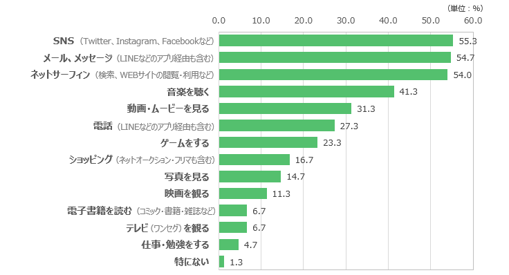 お風呂でスマートフォンを使うことがある人にどのようなことをしているのか答えてもらったところ、「SNS(Twitter、Instagram、Facebookなど)」が55.3%、「メール、メッセージ(LINEなどのアプリ経由も含む)」が54.7%、「ネットサーフィン(検索、WEBサイトの閲覧・利用など)」が54.0%でそれぞれ5割を超えた。次いで「音楽を聴く」が41.3%、「動画・ムービーを見る」が31.3%、「電話(LINEなどのアプリ経由も含む)」が27.3%、「ゲームをする」が23.3%と続いている。