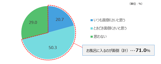 再び【自宅でお風呂に入る人】を対象に、お風呂(入浴やシャワー)が面倒くさいと思うことがあるかたずねたところ、「いつも面倒くさいと思う」が20.7%、「ときどき面倒くさいと思う」が50.3%で、合わせると7割に上った。