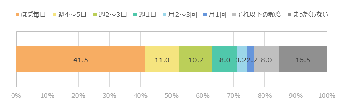 男女別では、女性では「ほぼ毎日」が66.3%と3人に2人を締め、「まったくしない」人は5.0%であった。