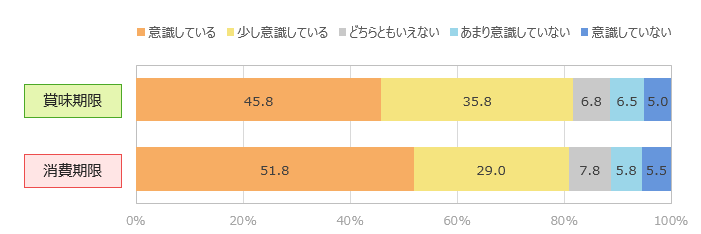 食品を選んだり購入する際、「賞味期限」「消費期限」をどれぐらい意識しているか答えてもらった。結果は、賞味期限・消費期限のいずれも「意識している(計)」が8割を占め、「意識していない(計)」が約1割となった。細かく見ると、賞味期限は「意識している」が45.8%、「少し意識している」が35.8%であるのに対し、消費期限は「意識している」が51.8%、「少し意識している」が29.0%と、「意識している」の割合がやや高くなっている。