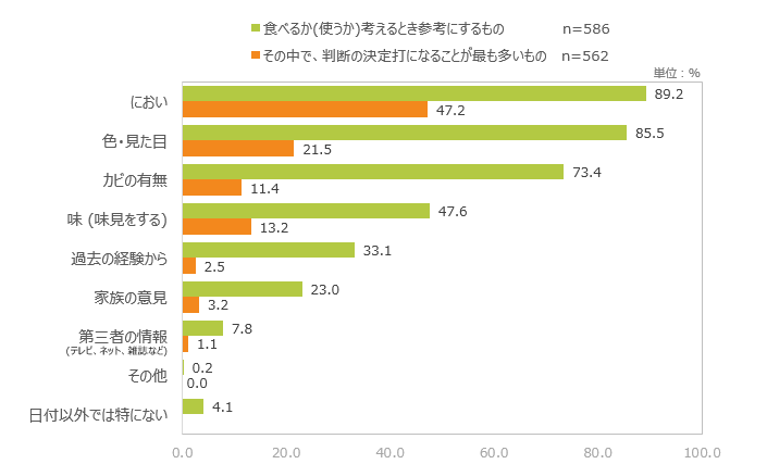 判断の参考とするもののうち「決定打になることが最も多いもの」としては、「におい」が47.2%で最も多かった。
