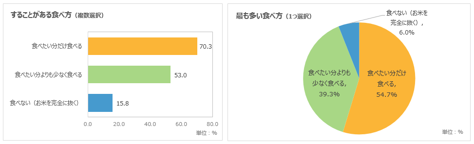 することがある食べ方の中で、【最も多い食べ方】を1つだけ選んでもらったところ、「食べたい分だけ食べる」は54.7%となり、「食べたい分よりも少なく食べる」が39.3%、「食べない(お米を完全に抜く)」が6.0%となった。食べる量をセーブすることが多いという人が45.3%となっている。