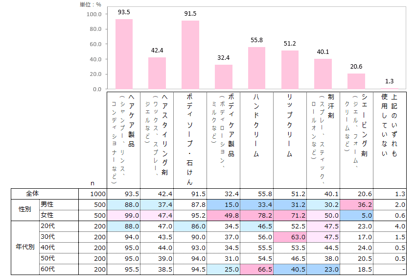 ■「ヘアケア製品」「ボディソープ・石けん」の使用率は9割、「ハンドクリーム」「リップクリーム」も5割超え n=1,000