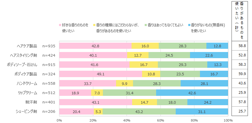 反対に、「香りがないもの(無香料)を使いたい」と答えた人の割合は、商品によってバラつきがあり、最も高いものは「リップクリーム」の42.6%、低いものは「ボディソープ・石けん」の12.3%となっている。