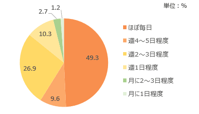 まず私服の購入頻度をたずねると、最も多いのは「3~4ヶ月に1回程度」の27.3%、ついで「半年に1回程度」の21.9%となった。「月に1回以上」は6.3%、「1~2ヶ月に1回程度」は13.4%で、半年に1回以上のペースで購入する人が全体の7割弱を占めた。1年に1回以下は合わせて27.9%となった。