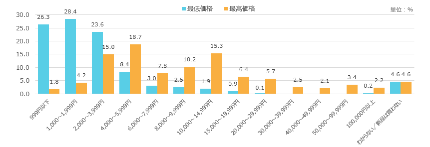 【最高価格】は「4,000~5,999円」の18.7%が最も多いが、「10,000~14,999円」と1万円を超える価格帯が15.3%で次に多く、30,000円以上(計)がおよそ1割を占めた。4,000円未満に回答の8割が集中した最低価格に比べると、価格帯はやや分散している。