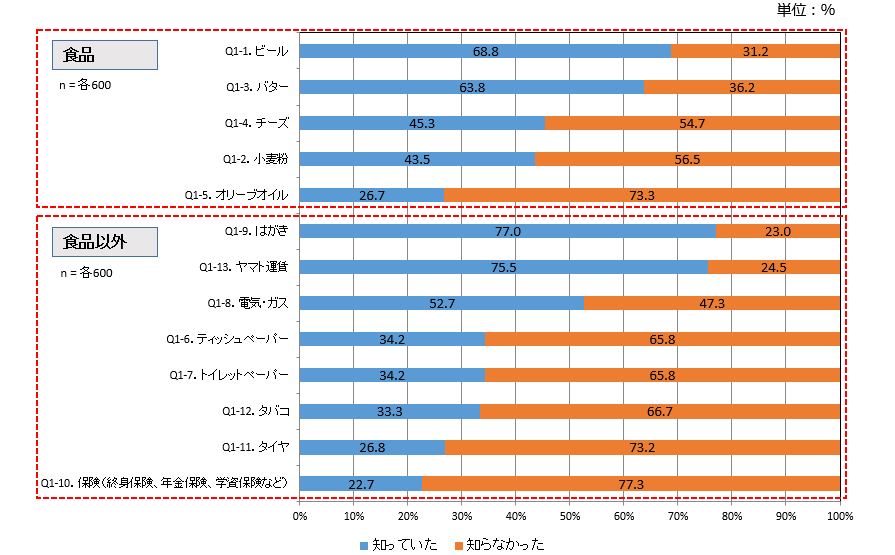 Q1.2017年は多くの物やサービスについて値上げが実施・予定されていますが、それぞれについて値上げすることを知っていたかお知らせください。(それぞれ1つずつ選択)