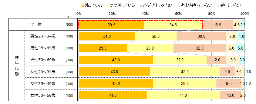 ・性年代別でみると女性20~34歳と女性50~69歳が、「感じている」「やや感じている」の合計が共に85.0%と最も高く、全体より10pt以上高い。